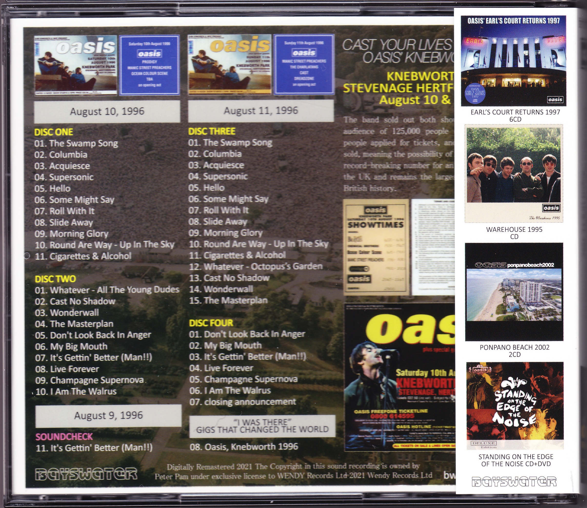 | Disc1 1: 1996/8/10 Live At Knebworth Park, Stevenage, England, UK. Sourced from various recordings* Disc1 2-11+Disc2 1-10: 1996/8/10 Live At Knebworth Park, Stevenage, England, UK. Sourced from ripping audio of Official Release "Knebworth 1996" 1st day Video. Just a pirate. Disc2 11: 1996/8/9 Soundcheck At Knebworth Park, Stevenage, England, UK. Sourced from ripping audio of Official Release "Knebworth 1996" Video. Just a pirate. Disc3 1 1996/8/11 Live At Knebworth Park, Stevenage, England, UK. Sourced from various recordings* Disc3 2-15+Disc4 1-7:1996/8/11 Live At Knebworth Park, Stevenage, England, UK. Sourced from ripping audio of Official Release "Knebworth 1996" 2nd day Video. Just a pirate. Disc4 8: Sourced from webcast by absolute radio (you can get it on various site eg. podcasts.apple.com) | ||||||||||||||||
